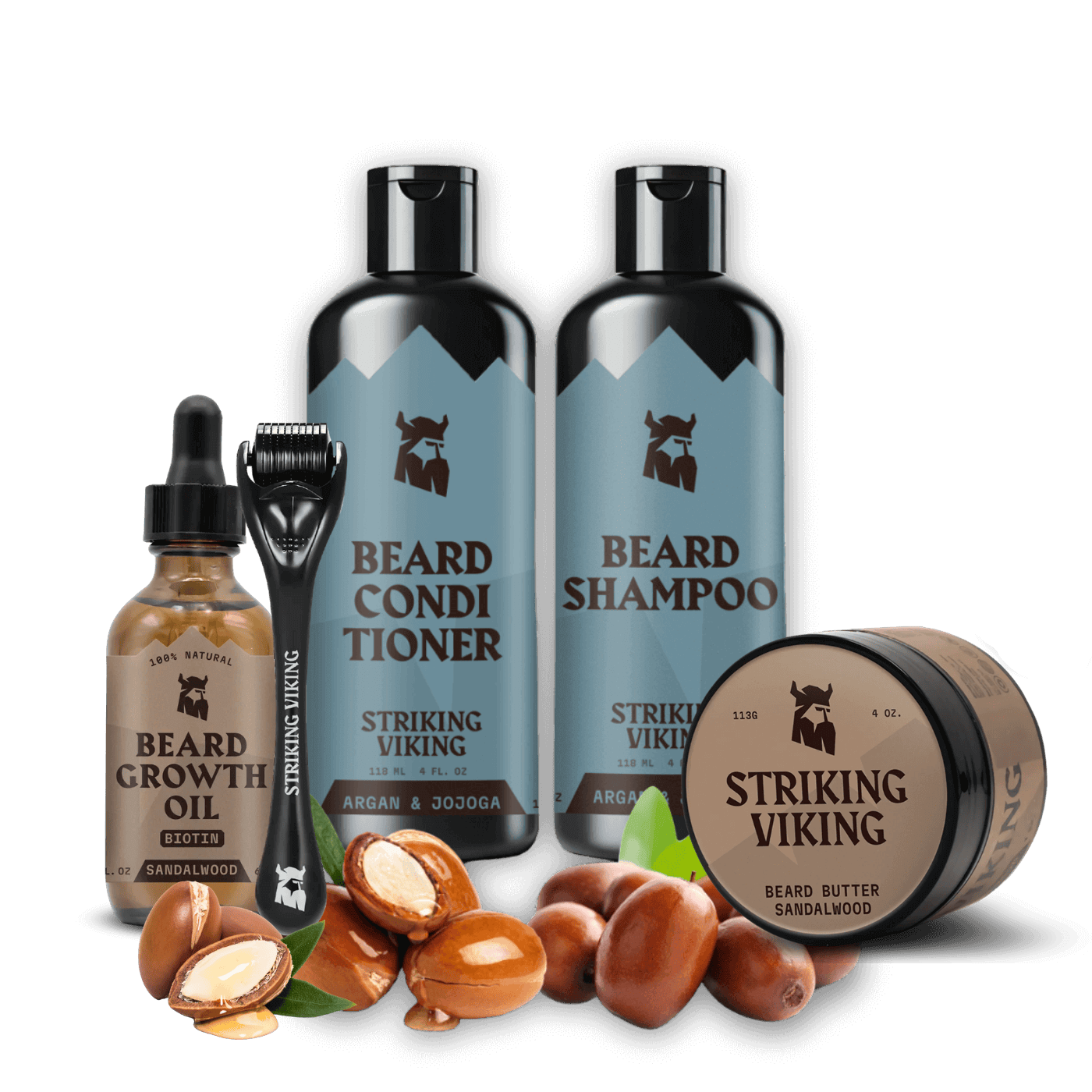 The beard growth kit includes a derma roller and sandalwood-scented growth oil to support fuller, thicker hair. The shampoo and conditioner gently clean and soften both beard and skin. The rich, non-greasy beard butter keeps the beard smooth and nourished all day.